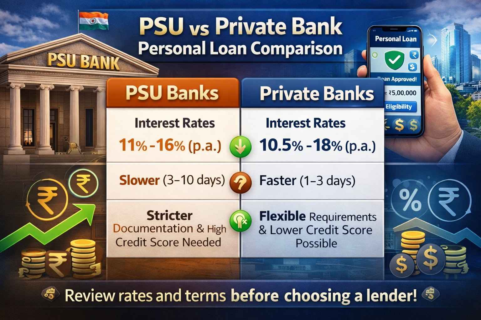 Comparing personal loan interest rates between PSU and private banks is crucial if you want to minimize borrowing costs. PSU banks offer stability and decent rates for strong profiles, while private banks shine with faster processing and competitive digital offers. Analyze your financial profile, compare APRs including fees, and choose the lender that aligns with your repayment ability and goals.